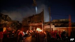 ทีมนักผจญเพลิงอิรัก ตรวจสอบซากความเสียหายในอาคารที่คาราคอช หรือเป็นที่รู้จักในชื่อฮัมดานิยา ในวันพุธ ขณะที่ญาติผู้เสียชีวิตรวมตัวด้านหน้าห้องเก็บศพ ในเมืองโมซุลที่อยู่ใกล้เคียง เพื่อรอการระบุอัตลักษณ์ของญาติผู้ล่วงลับจากเพลิงไหม้ในงานวิวาห์